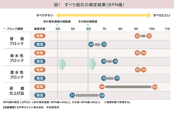 太平洋セメント舗装ブロック工業会では、会員会社よりインターロッキングブロックの提供を受け、すべり抵抗を測定しました。その結果、今回すべり抵抗を測定したインターロッキングブロックは、いずれもBNP値の規格値(歩行者系道路:40以上)およびC.S.Rの推奨値(案)(敷地内の通路:0.4以上)を満足しました。