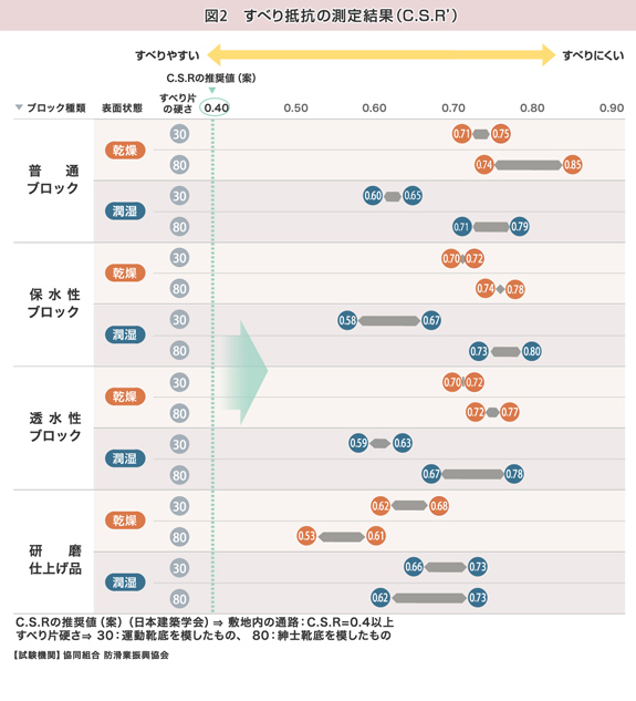C.S.Rの試験方法は、JIS A 1454「高分子系張り床材試験方法」に規定されています。国土交通省「高齢者、障害者等の円滑な移動等に配慮した建築設計標準」では、床の材料・仕上げは、社団法人日本建築学会材料施工委員会内外装工事運営委員会床工事WG『床の性能評価方法の概要と性能の推奨値(案)』を参考にして適切な材料・仕上げとすることが望ましいとしています。インターロッキングブロックが用いられるような「敷地内の通路」等では、C.S.R=0.4以上が推奨値(案)として示されています。