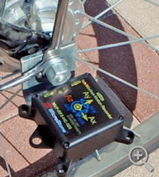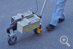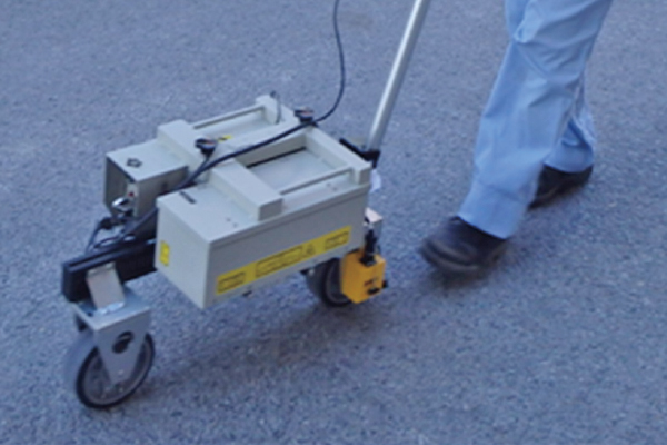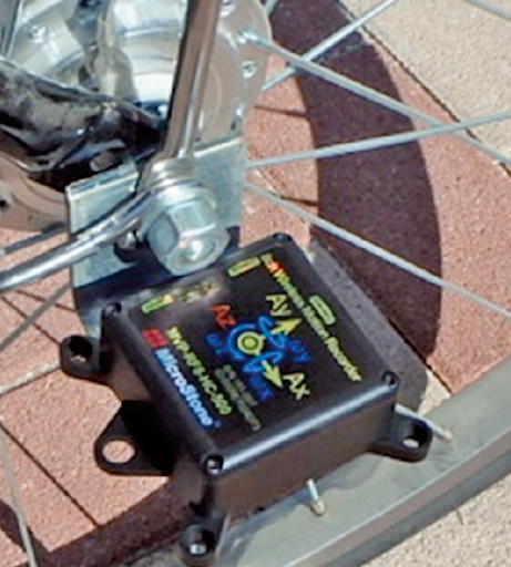 シティサイクル車(26インチ)の前輪に3軸加速センサを取り付けて、インターロッキングブロック舗装とアスファルト舗装の走行時の振動特性を測定しました。また、マルチロードプロファイラを使用して舗装路面の平坦性を測定しました。