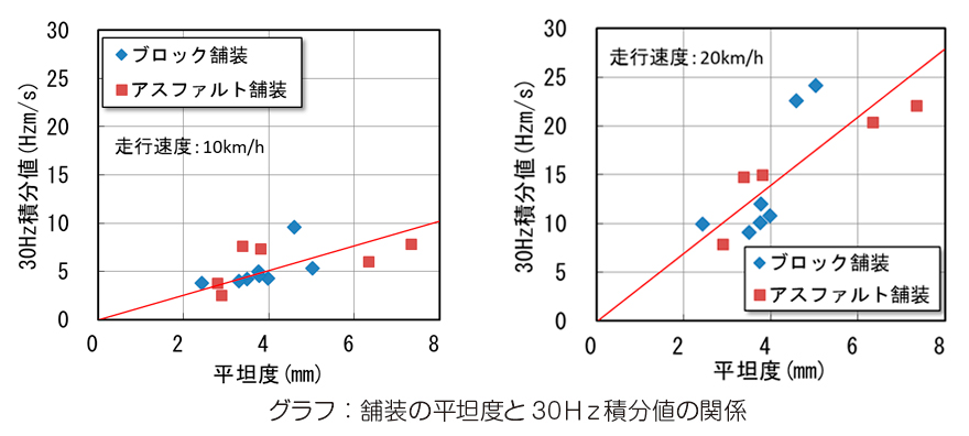 人体は30Hz以下の振動を不快と感じるため、路面の平坦度との関係を調査しました。
