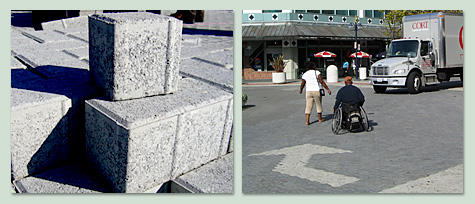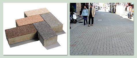 平板の一般的な寸法は、30~40cm角、厚さ6cmである。種々のものを組み合わせることにより、変化に富む舗装面を形成できる特長があります。